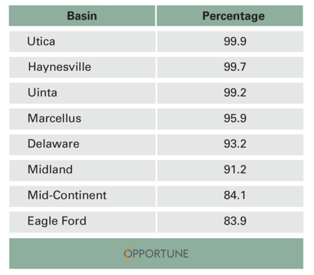Along the same lines, the percentage of gross operated production controlled by the top 20 producers in most major basins has risen sharply. It is higher than 90% in six plays, and higher than 80% in two others (Table 1).